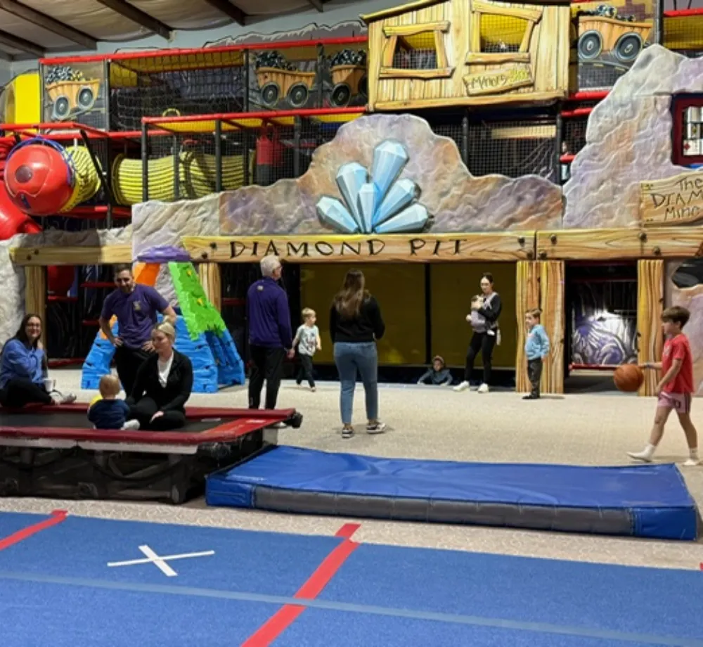 60 minutes of private play in the Diamond Mine foam pit, rock wall, bounce house, and tumble track and 30 minutes in party area for pizza, cake and ice cream.